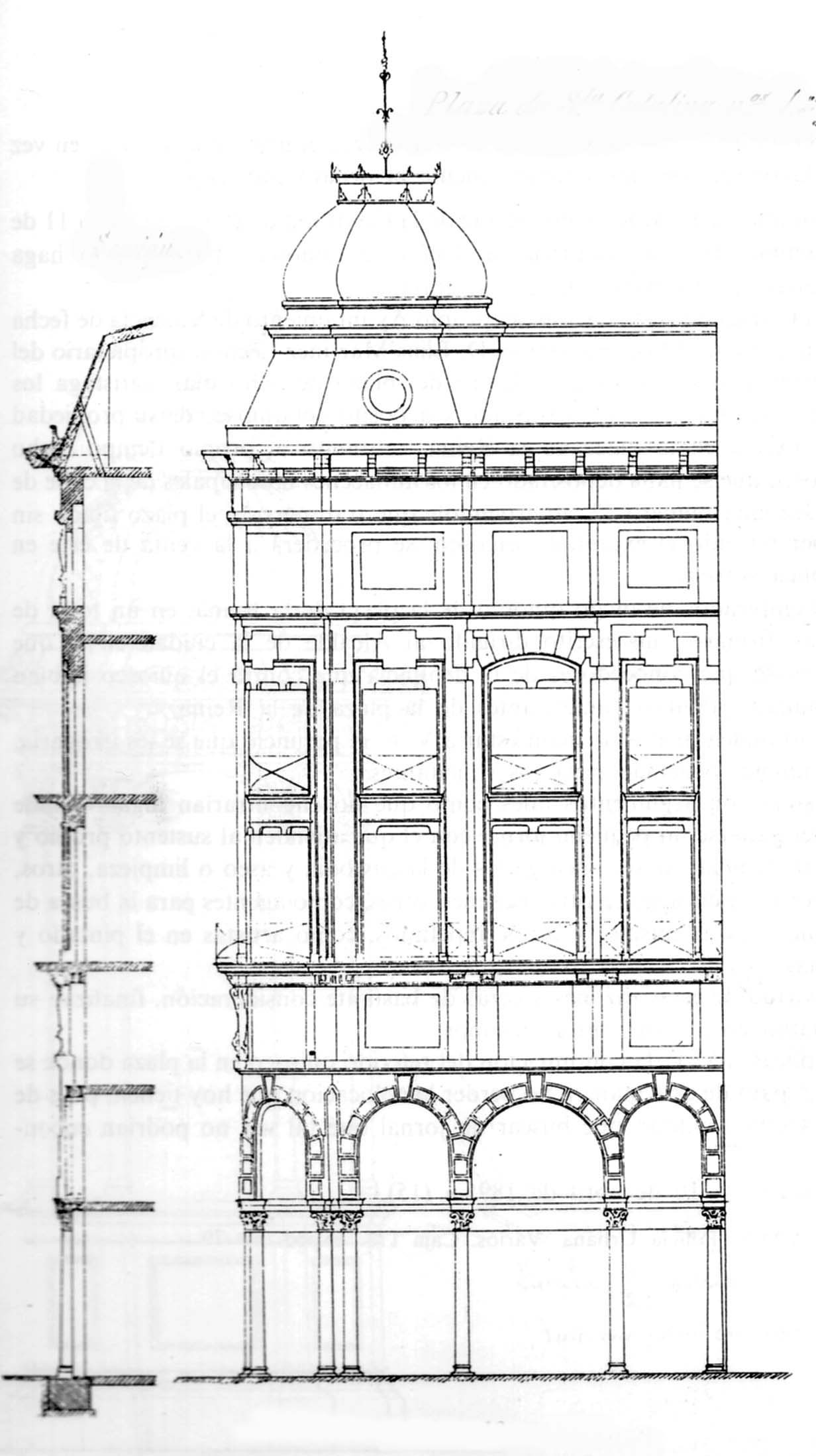 Estilo ecléctico con elementos ornamentales de inspiración francesa. Tiene doble entresuelo, columnas de hierro fundido y cupulino con óculos en el chaflán. Fue diseñado a solicitud de Pedro Sánchez de León
