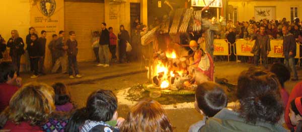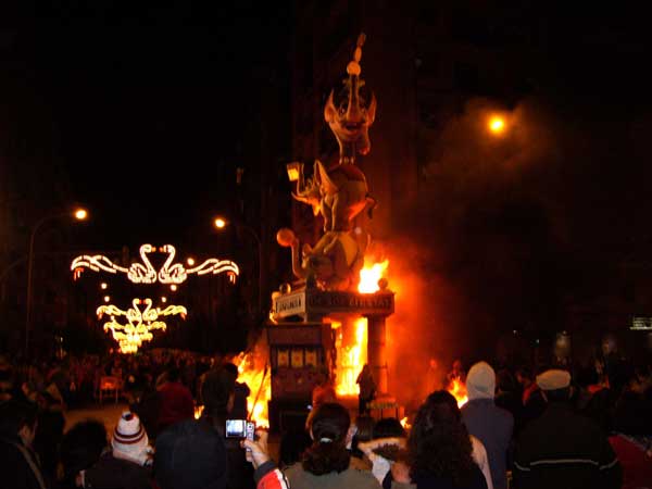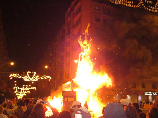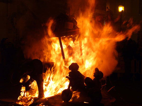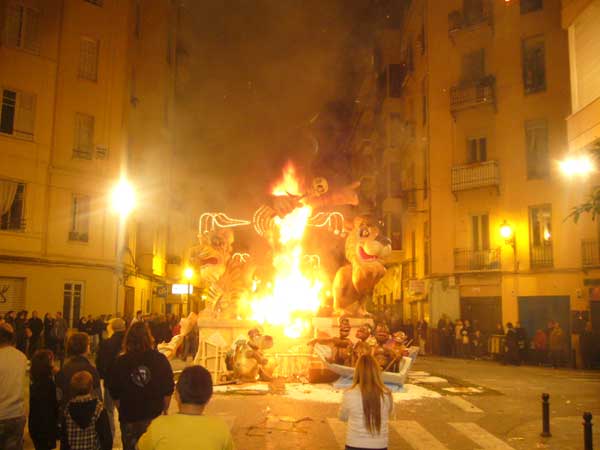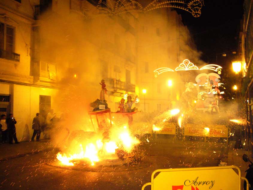LA CREMÁ ¿Cuándo se queman las fallas? La noche de San José, es decir la noche del 19 al 20 de marzo ¿Por qué se queman? El fuego es la esencia de la fiesta, purifica los vicios y males de la sociedad y se inicia un nuevo ciclo, es una renovación desde las cenizas, en el comienzo de la primavera. ¿A que hora se queman las fallas? Oficialmente las fallas infantiles en torno a las diez de la noche del 19 de marzo. Las fallas grandes a medianoche. Sin embargo algunas necesitan las presencia de los bomberos y arden durante las dos primeras horas del día 20. La falla municipal arde a la 1.00h de la madrugada ¿Dónde presenciar una crema? La cremá de la falla (quema) se puede ver en cualquier barrio. Sin embargo es aconsejable buscar algún barrio castizo con varias fallas próximas. Ello nos permitirá ver más de una “cremá”. Aconsejamos la zona de Gran Vía, el Carmen o el barrio de Ruzafa, el truco está en seguir a los bomberos. Donde estén ellos, la falla no tardará en arder. ¿Desde que lugar presenciar la cremá? En las fallas más grandes no se sitúe en primera fila, el calor del fuego le empujará rápidamente hacia atrás. ¿Cómo se quema una falla? La falla es preparada previamente con tracas y cohetes. Antes se vierte gasolina sobre ella y la fallera mayor prende la mecha de la traca que encenderá la falla. Previamente suele dispararse un pequeño castillo de fuegos artificiales. ¿A que hora se alcanza la culminación de la noche de la cremá? Resulta espectacular la medianoche del 19 de marzo (madrugada del 20) ya que desde todos los puntos de la ciudad son disparados fuegos artificiales. En medio de ellos empiezan a arder las casi cuatrocientas fallas grandes, tiñendo de amarillo y rojo el cielo de la ciudad. |