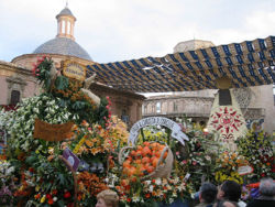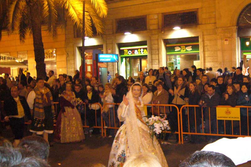 Por las calles más céntricas desfilan las comisiones falleras con todos sus componentes ataviados con el traje regional valenciano para llevar flores a la patrona de la ciudad y su región, Nuestra Señora de los Desamparados.