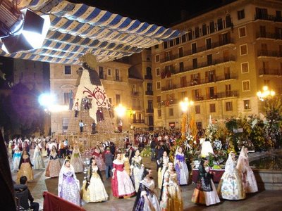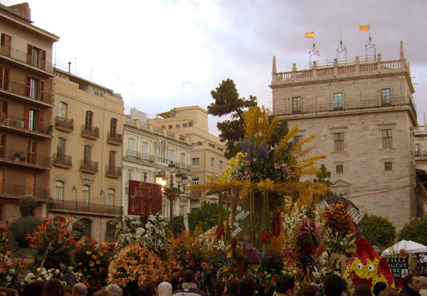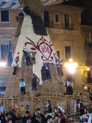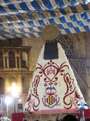 En la plaza de la Virgen, allí se instala un gran catafalco de madera con la figura de la patrona. El manto va siendo tejido con las flores que los valencianos depositan. En la fachada de la Basílica sendas estructuras de metálicas acogen el resto de ramos.